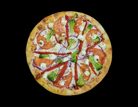 Соус томатный, сыр моцарелла, красный лук, помидоры, перец болгарский, брокколи, сыр фето, чесночное масло.