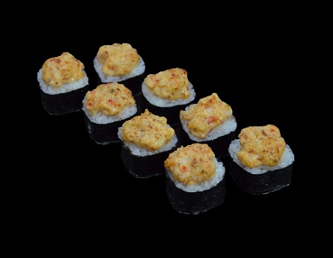 Сливочный сыр, сурими, запеченный под шапочкой из тигровой креветки и соуса спайс.